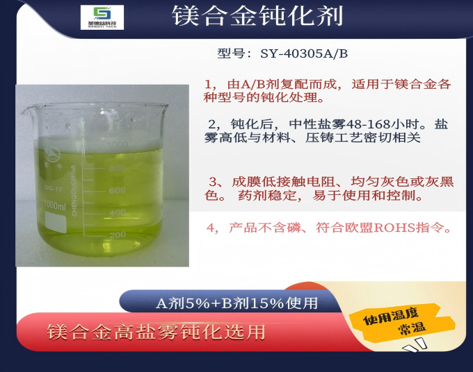 镁合金材料具有质轻、硬度高的特性,在机械行业中具有独特的应用效果,但是镁合金的耐腐蚀性比较差,因此必须进行表面处理;本公司拥有的镁合金表从清洗、蚀刻、表调、钝化、封闭全面配套的药剂,处理镁合金不仅耐腐蚀性大大提高,而且具有提高油漆附着力。本药剂广泛使用在镁合金的航天、汽车、自行车、电子产品的配件中。